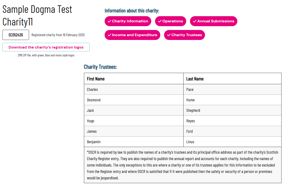 Charities can update their trustee information at any time through OSCR Online. While OSCR now collects a range of information about trustees for regulatory purposes, only the names of each trustee will be published on the charity’s page on the Register. Some exemptions may apply. No other personal information will be published.